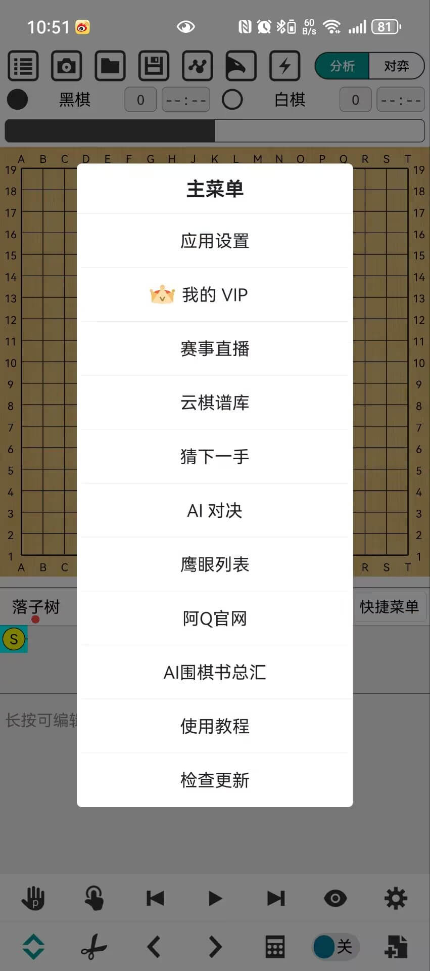 点击 主菜单 按钮将会显示 应用设置、**我的 VIP、赛事直播、云棋谱库、猜下一手、AI 对决、**鹰眼列表** 等功能入口