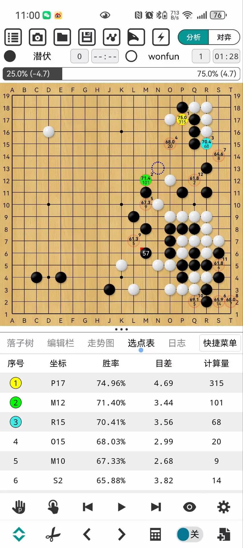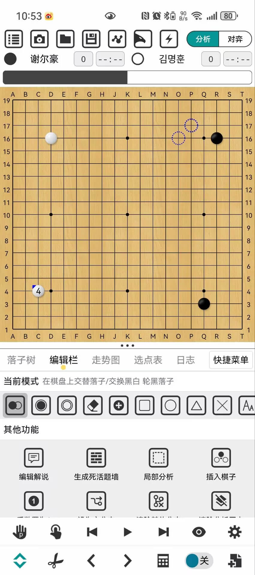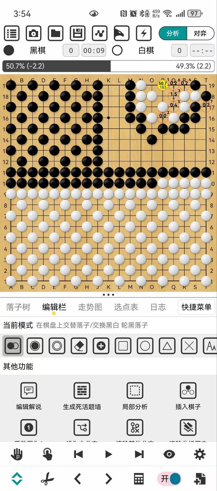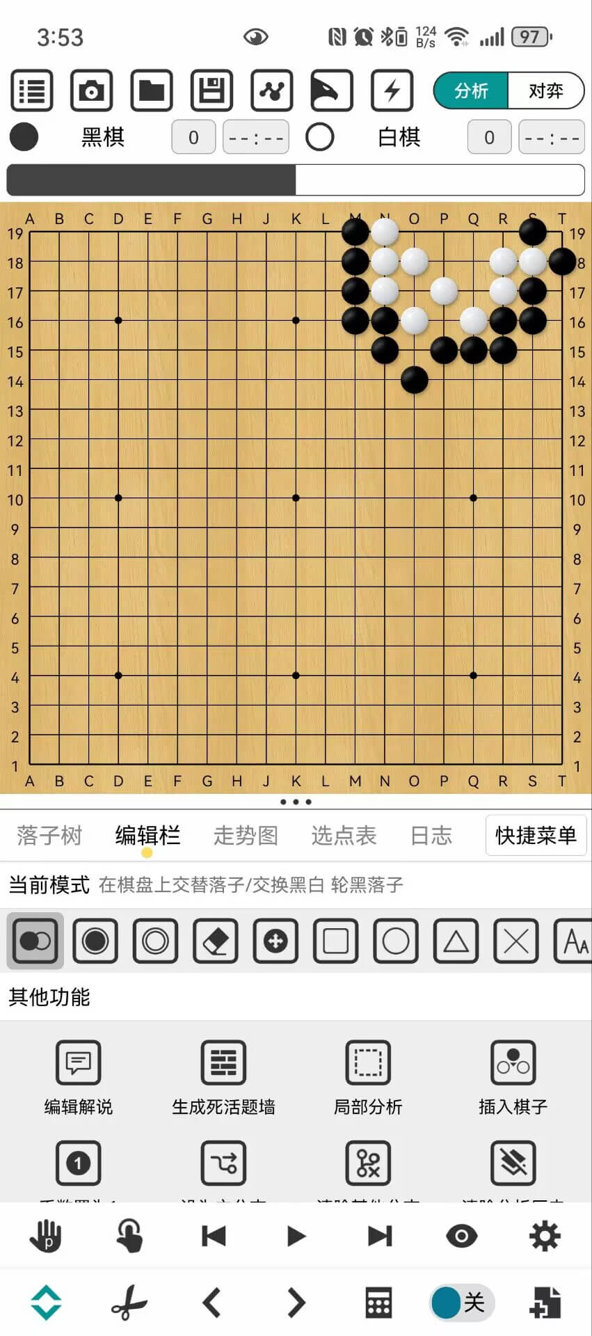 导入棋谱后,点击底部 分析开关,即可开始复盘分析