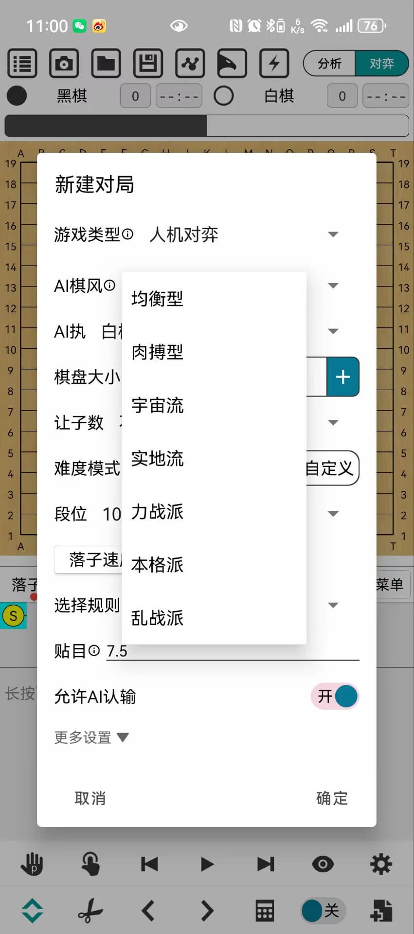 在弹出的设置弹窗中,可以对 AI 棋风、难度、规则等进行调整,然后点击确定即可开始对局