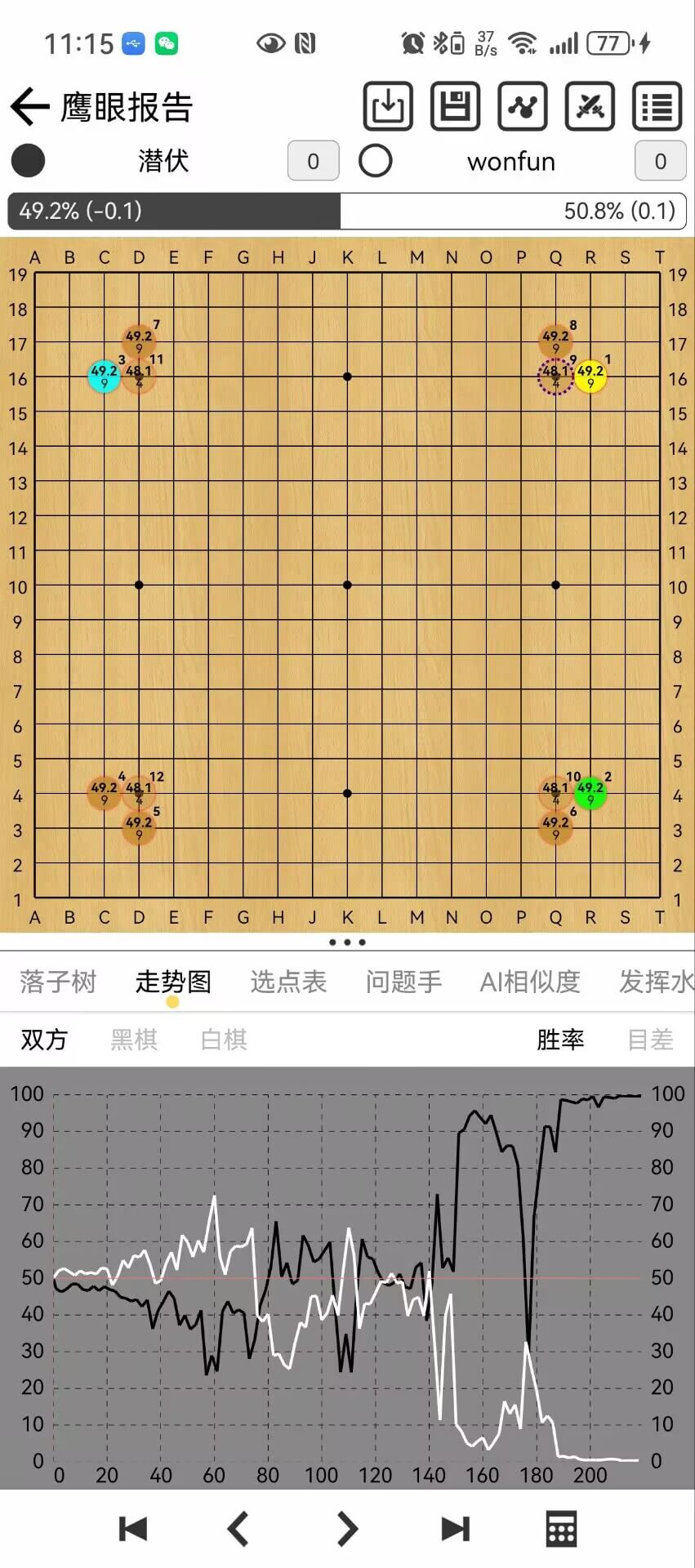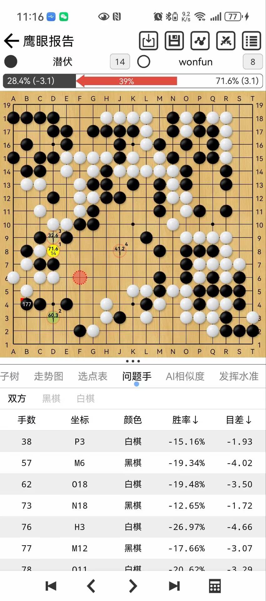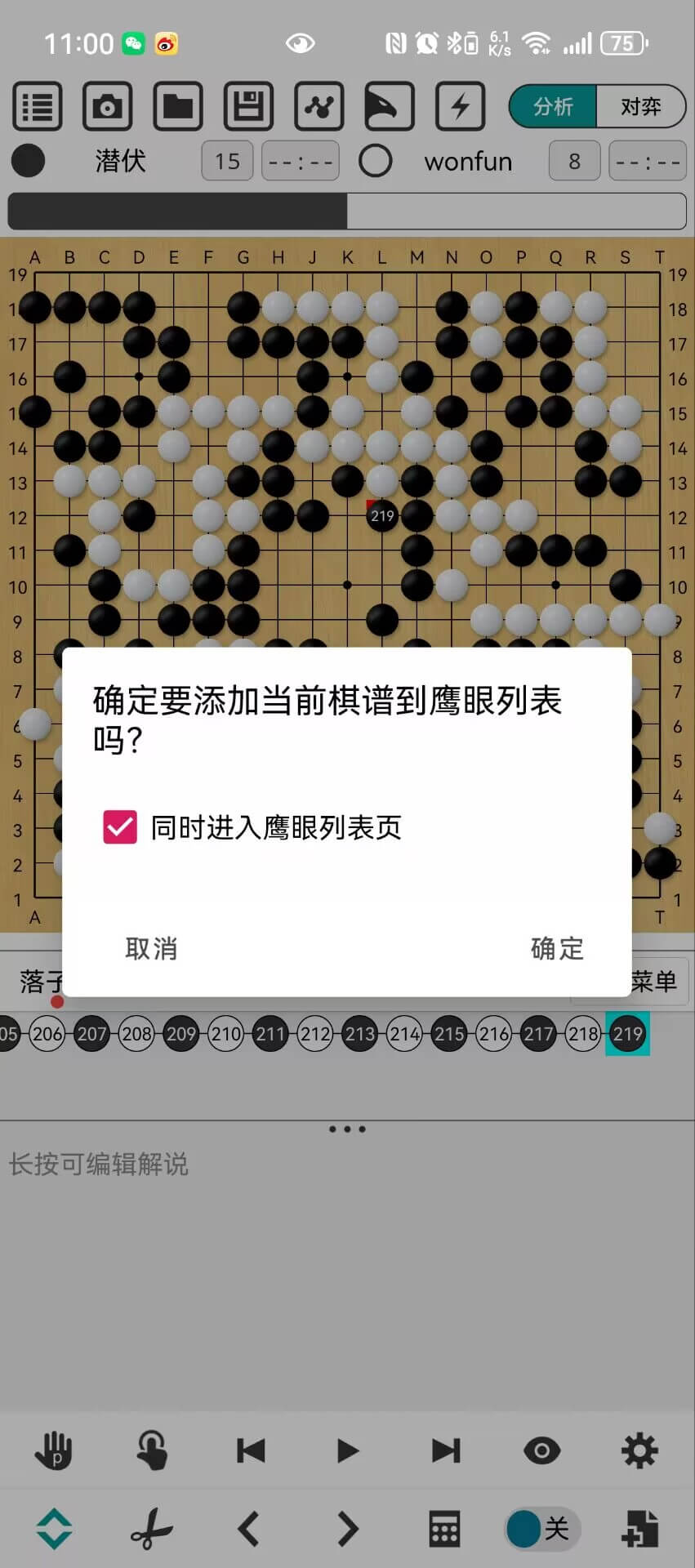 点击 分析 按钮,开始对棋谱进行鹰眼分析