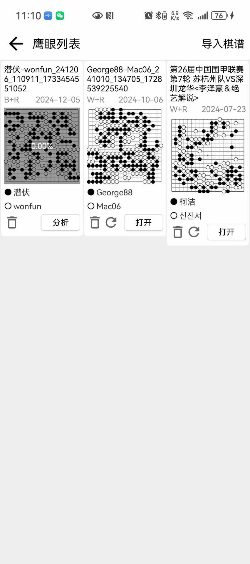 点击顶部 鹰眼分析 按钮,添加当前棋谱到鹰眼列表,同时进入鹰眼列表页,