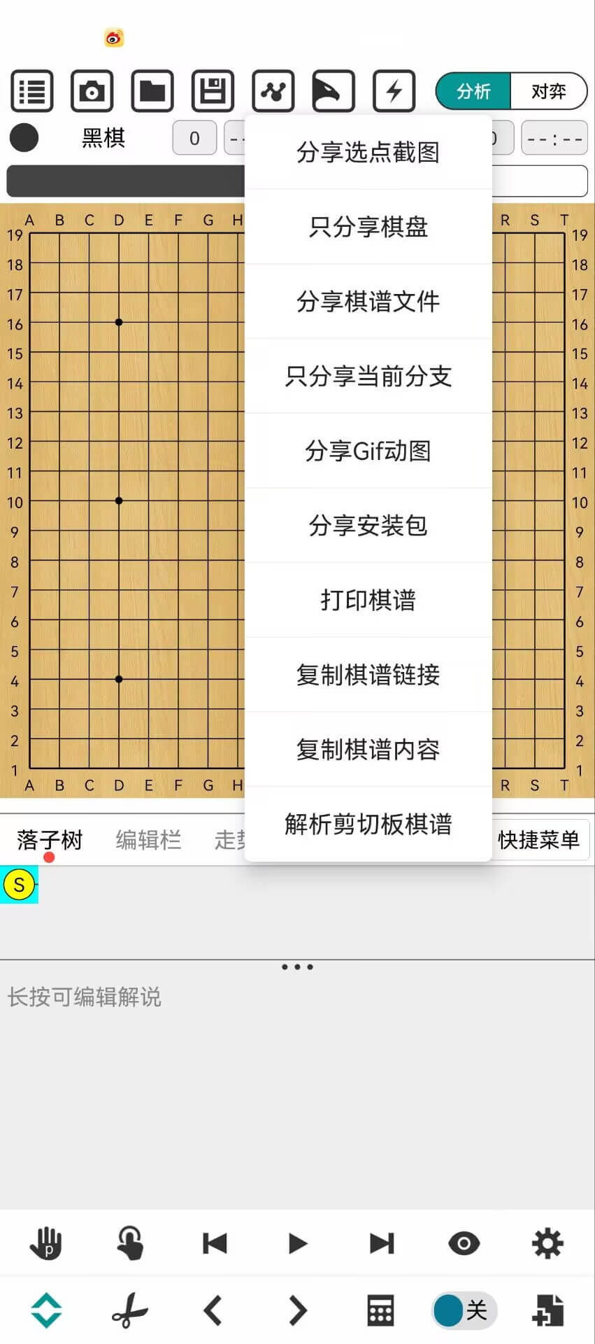 点击 分享菜单 按钮将会显示 分享选点截图、分享棋谱文件、分享 Gif 动图、打印棋谱、复制棋谱内容 等功能入口