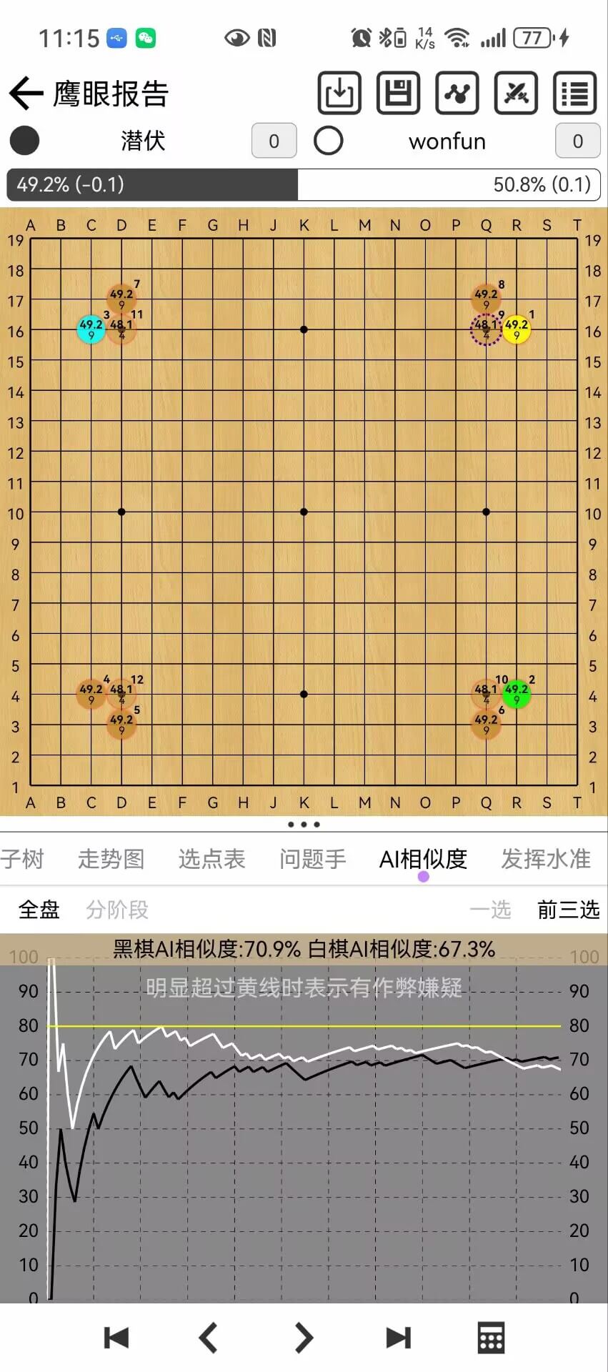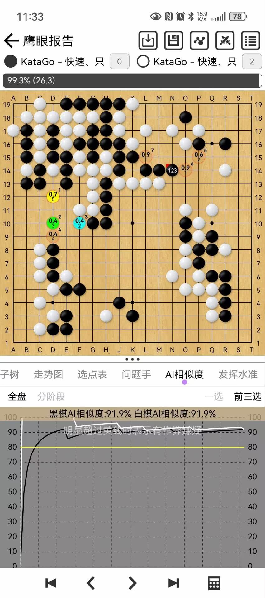 在 AI 相似度 标签页即可看到本局棋的双方 AI 重合度