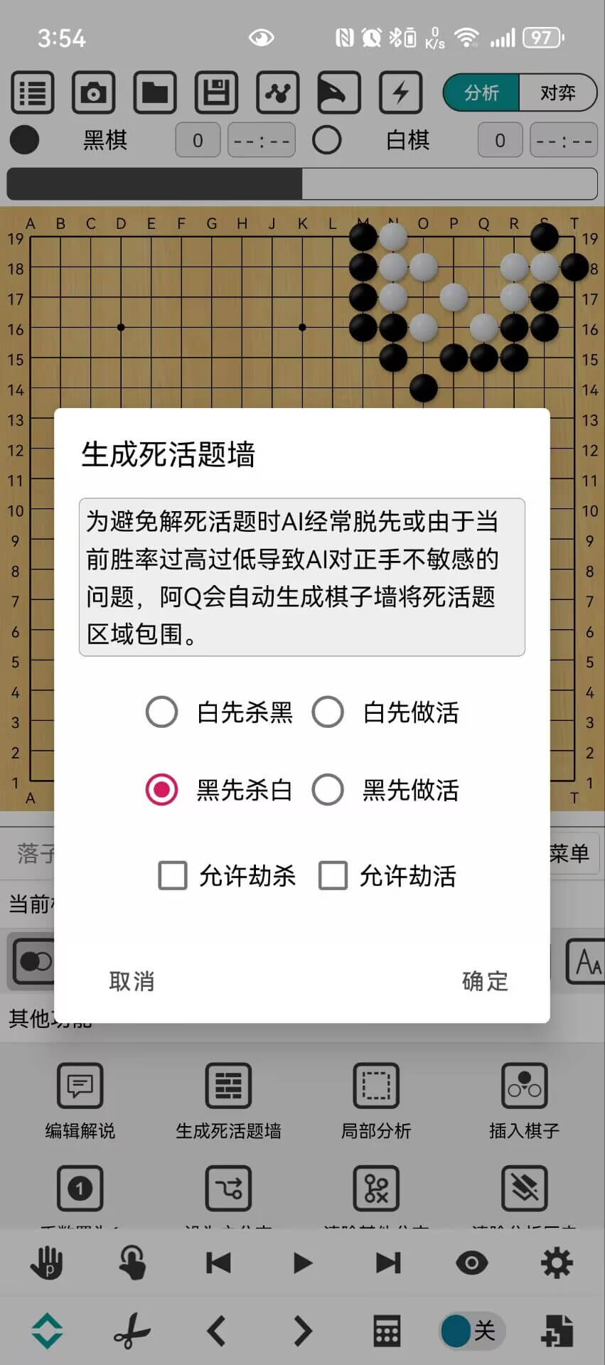 勾选死活题目标及是否允许打劫后,点击确定按钮,生成死活题墙辅助解题