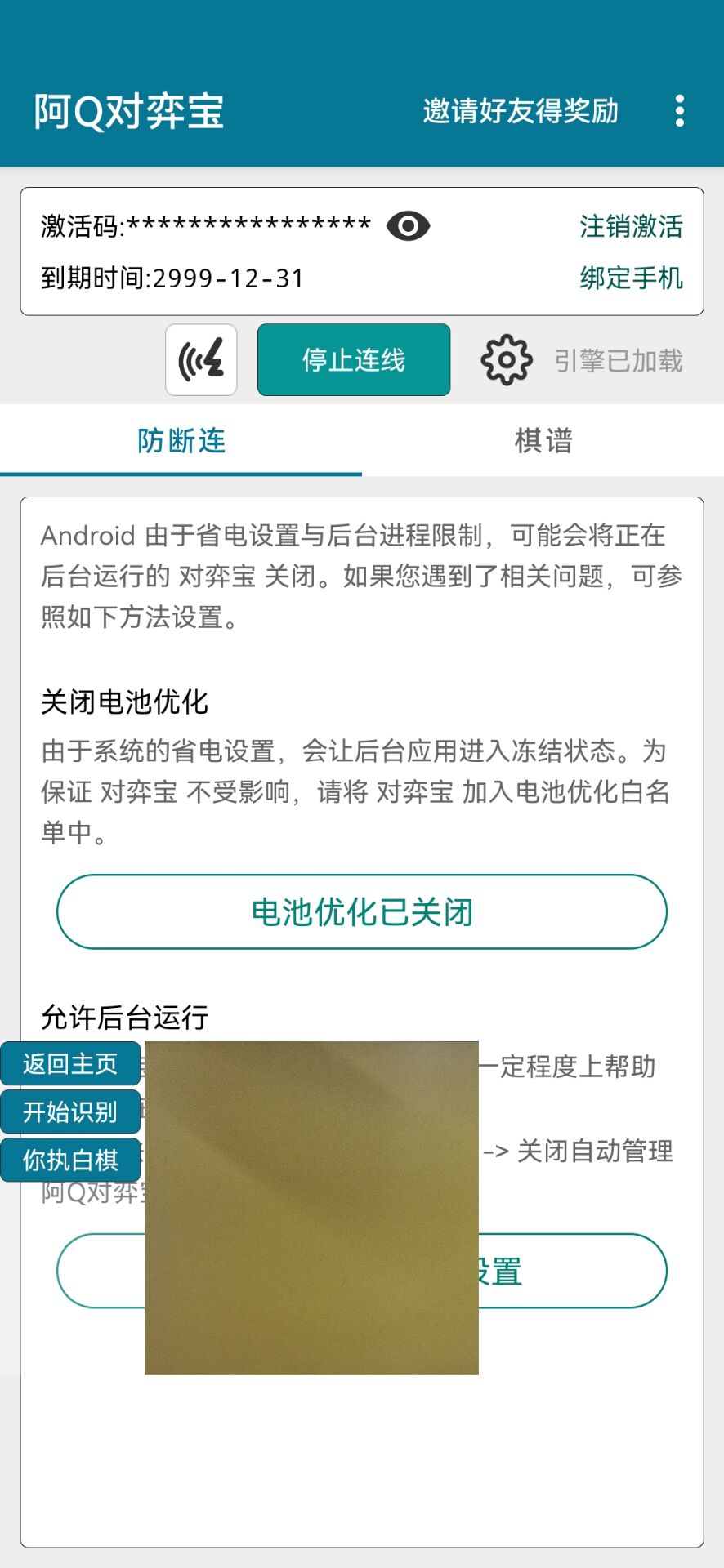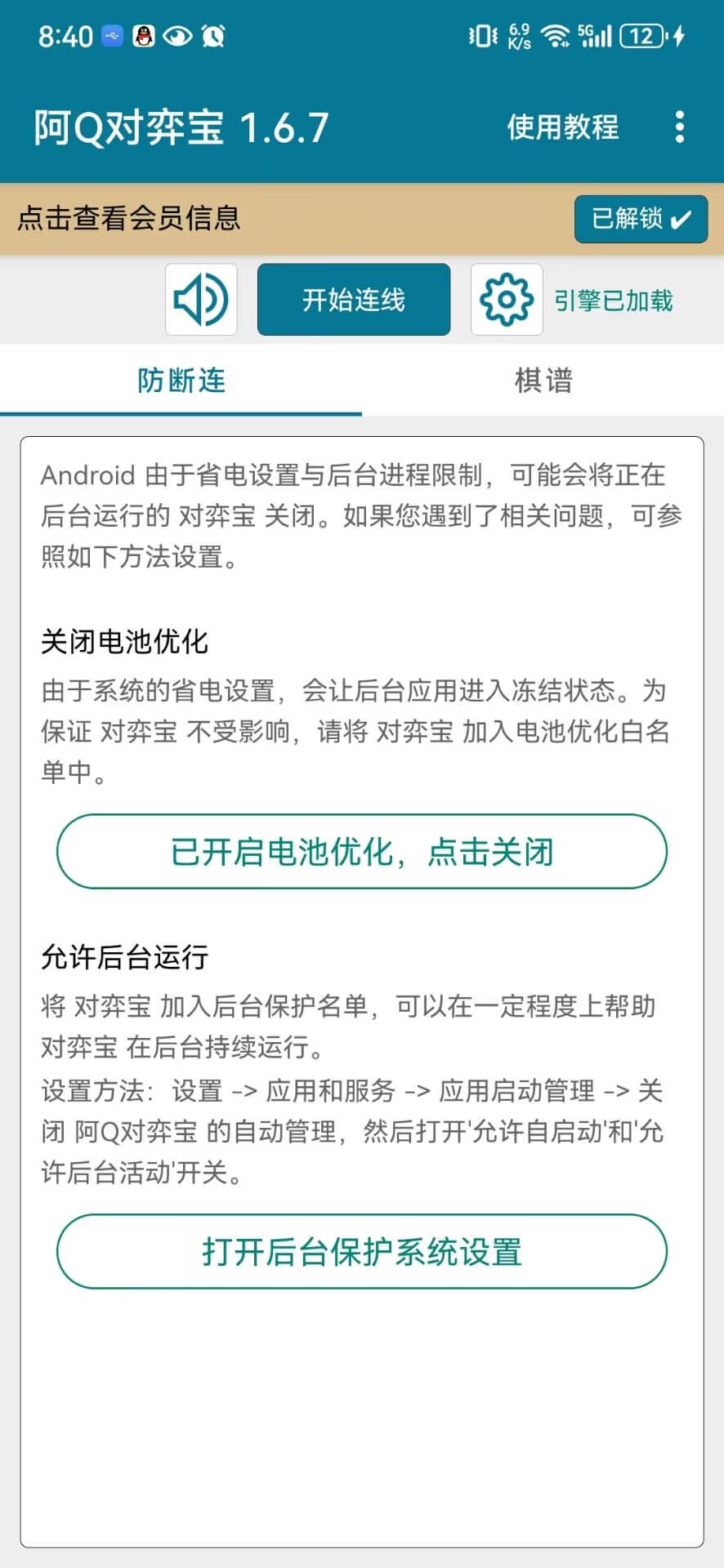 进入连线第三方平台主界面后,请先检查防断连设置,关闭电池优化,允许后台运行,否则某些手机为了省电可能自动关闭在后台的对弈宝